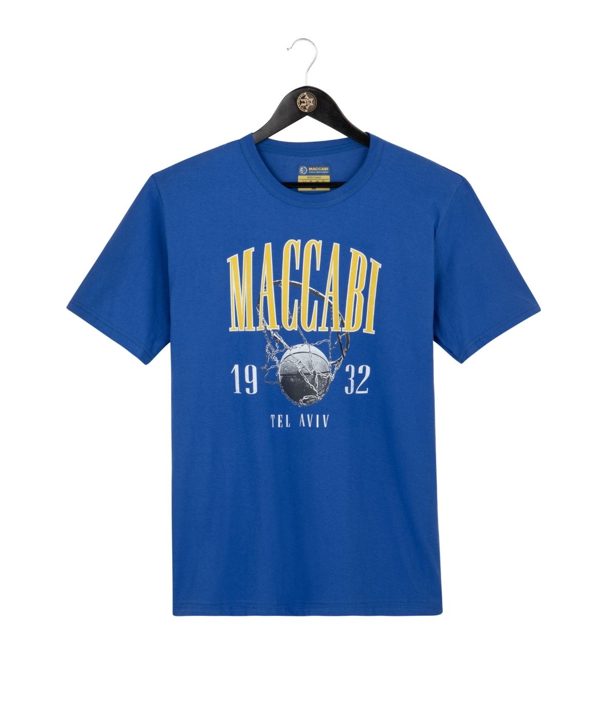 טי שירט מכבי תל אביב בעיצוב 'סל ברזל' לבוגרים בצבע כחול מקולקציית ביגוד MCB.